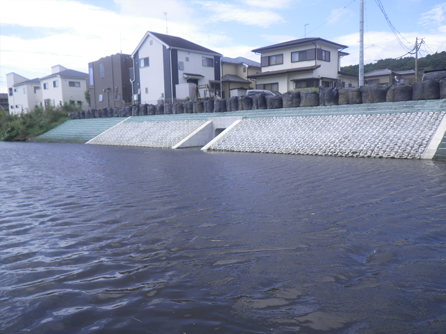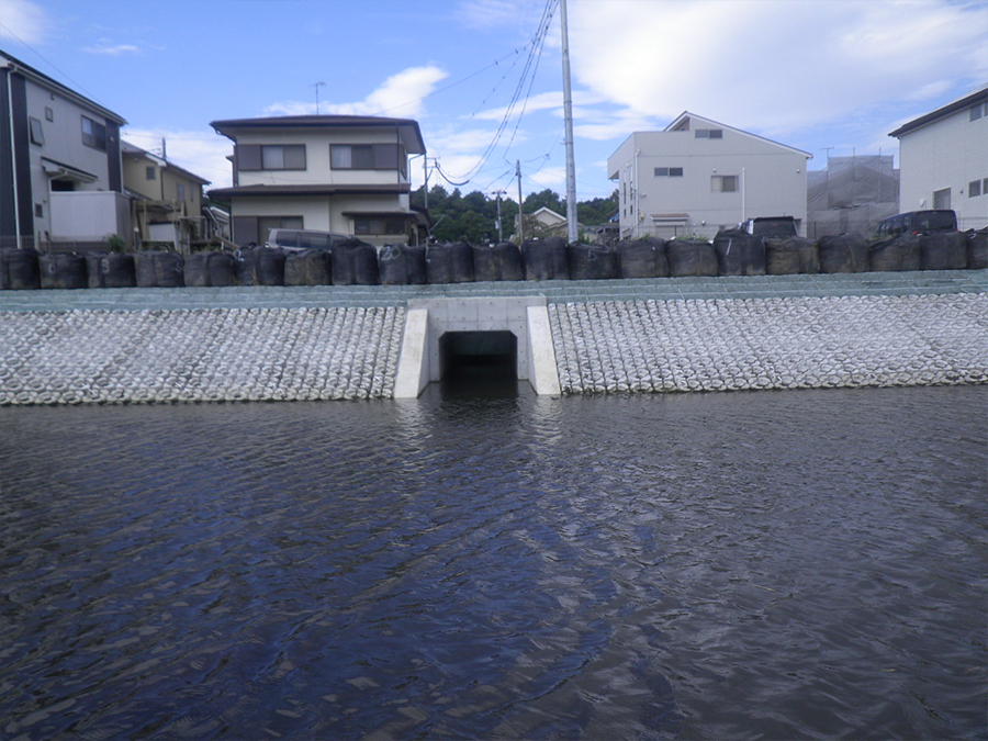 | 担当者の一言 | 川幅が狭く、雨が降ると川の増水より住宅街からの排水が多くて排水ポンプの容量が間に合わずに現場が直ぐに水没してしまい次の日は水替えで作業が終了してしまう日々でした。また、軟弱地盤の掘削から法面を整形する作業には苦労が絶えない日が多くて大変な現場でした。 |