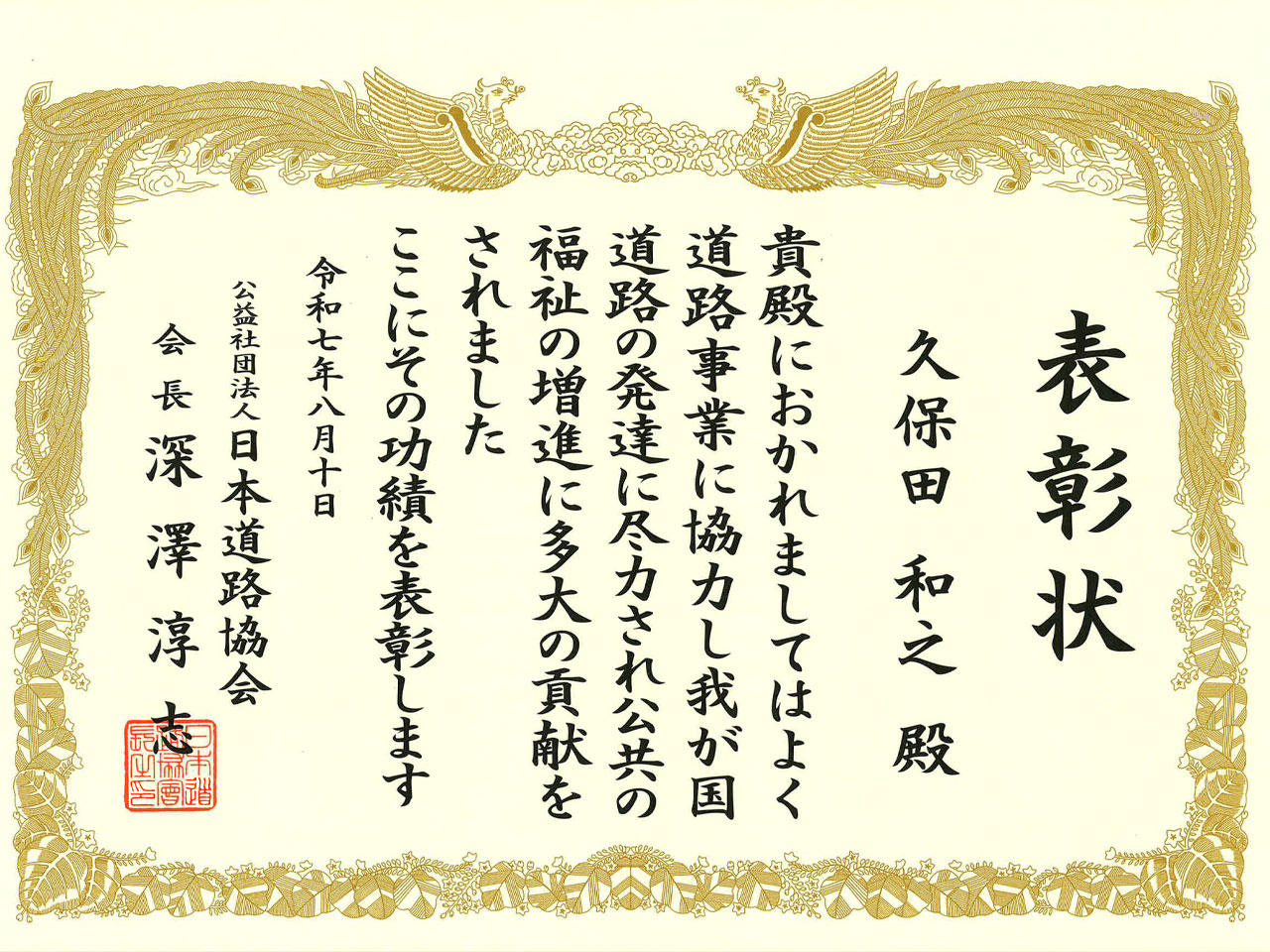 道路功労者表彰を受賞しました この度、弊社の工事部長が、日本道路協会より道路功労者表彰を授与されました。 この賞は、悪天候や地震発生時に担当路線の安全を確保するため、迅速な道路巡回活動を実施するなど、多年にわたる道路の維持管理・安全確保への貢献が認められたものです。 日頃より、地域の皆様の生活を支える道路の安全を守るため、尽力してきたことがこのように評価され、嬉しく思います。 今後もより一層の努力を続けてまいります。